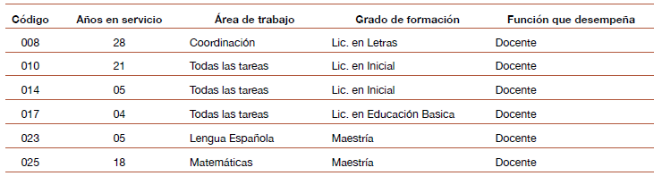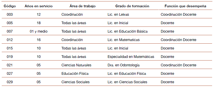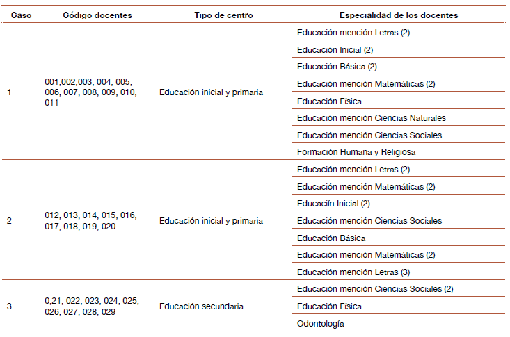 La población en la que se inscribe la muestra pertenece a la provincia del Gran Santo Domingo, municipio Santo Domingo Oeste. Para la recolección de los datos, se utilizó un muestro probabilístico, a través de una selección aleatoria simple, con un total de 29 docentes, de tres centros educativos (en adelante caso 1, 2, 3), de carácter público y JEE, atienden los niveles inicial, primaria y secundaria. En el cuestionario participó el total de la muestra seleccionada presentada en la tabla 1; en la entrevista se redujo la muestra a diez participantes caracterizada en la tabla 2 y el guion de observación se redujo a seis participantes presentados en la tabla 3.