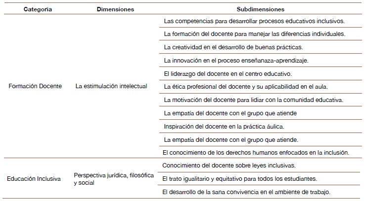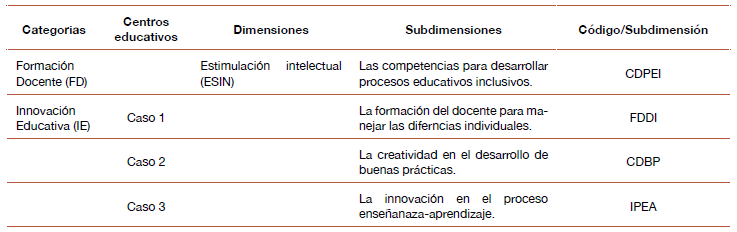 En la organización de los datos para su análisis se mantuvieron las dos categorías: formación docente y educación inclusiva que fueron desagregadas en la dimensión estimulación intelectual y cuatro subdimensiones. El análisis se realizó en tres niveles: el primer nivel centros educativos, segundo las dimensiones y tercero los subdimensiones, especificados en la tabla 5. Los resultados se presentan en función del tercer nivel.