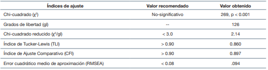 El instrumento aplicado para medir la autopercepción sobre las competencias para escribir, fue la Escala para Evaluar Artículos Científicos en Ciencias Sociales y Humanas-EACSH. Esta evalúa el grado de calidad en la redacción de un artículo científico por parte de investigadores con diferentes grados de experticia. El instrumento presenta una confiabilidad de 0,937; y consta de 19 ítems distribuidos en ocho dimensiones: portada y resumen (1-3), introducción (4, 5), metodología (6-9), resultados (10-12), discusión (13-16), referencias (16), apéndices (17) y estilo y formato (18, 19). Fue validado en contenido y constructo por López-López et al. (2019); cada ítem se valora con cinco niveles: muy bajo, bajo, medio o aceptable, medio alto y muy alto, y se responde en promedio en 12.5 minutos. Al validarlo, se encontraron ocho factores mediante el análisis factorial exploratorio. Lo mismo cabe decir del análisis factorial confirmatorio realizado en esta investigación, cuyos criterios de bondad de ajuste se muestran en la tabla 1.