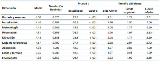 Primero, se evaluaron los niveles obtenidos en la redacción de artículos, tanto de forma general como por dimensiones del artículo. Para medir si los resultados diferían estadísticamente de una autoevaluación media, se usó una prueba t de una muestra, comparando las medias obtenidas con la media teórica del instrumento (valor = 3). En general, se encontró que el nivel de redacción de los investigadores fue alto, con diferencias significativas respecto a la media teórica del instrumento, y un gran tamaño del efecto medido mediante d de Cohen, que oscilaron entre 1 y 2 desviaciones estándar del valor medio. Se observa como mayores fortalezas la redacción de los Resultados y Lista de referencias, mientras que las mayores oportunidades están en la redacción de Estilo y formato y Apéndices (tabla 2).