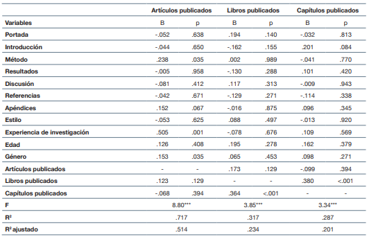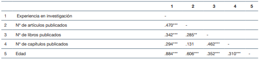 En la tabla 3 se muestran algunas correlaciones de Pearson obtenidas entre las variables de publicación de artículos, libros y capítulos, y algunas variables sociodemográficas como la experiencia en investigación y la edad. Los resultados mostraron que la experiencia investigativa correlacionaba tanto con la edad, como era esperable, y con los tres tipos de publicaciones, aunque con tamaños del efecto variable. Por ejemplo, la relación entre experiencia investigativa y publicación de artículos fue más fuerte (r = .470, p < .001) que entre experiencia investigativa y publicación de capítulo de libro (r = .294, p < .001). Para evitar que las publicaciones de un tipo interfieran en las correlaciones de otro, los análisis fueron replicados, esta vez controlando el efecto de otro tipo de publicaciones en cada caso. En esta segunda ronda de análisis, solo la publicación de artículos (rp = .419, p < .001) mantuvo una fuerte relación con la experiencia investigativa. La publicación de capítulos tuvo una relación débil con la experiencia investigativa (rp = .179, p = .044), mientras que la publicación de libros (rp = .148, p = .097) dejó de mostrar una relación significativa con la experiencia investigativa.
