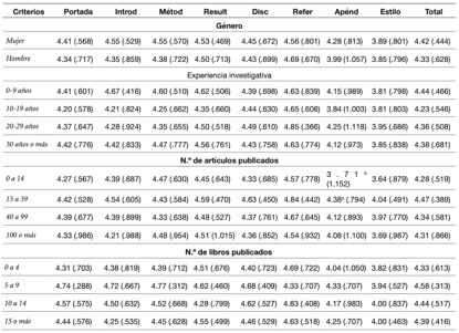 El segundo objetivo buscó determinar si había diferencias significativas en la calidad de la escritura por género, experiencia docente investigativa y el número de artículos y libros publicados. En general, no existió diferencia significativa por ser varón o mujer; similar al hallazgo de Sword et al., (2020) con investigadores de diversos países, en el que el género no desempeñó un papel estadísticamente significativo. Sin embargo, hay estudios que presentan algunas diferencias de redacción como el de Boettger y Wulff (2019): las mujeres redactaban con mayor cantidad de adverbios y verbos pasivos que los varones; aunque coincidieron en usar los mismos marcadores de estilo en sus retóricas. Por lo tanto, la diferencia parece radicar más en el estilo que en la calidad de la escritura, escribiendo de manera libre, aunque conservando criterios ya establecidos; características relevantes en investigadores expertos de distintas disciplinas (Dorfler y Eden, 2019).
