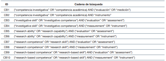 Esta investigación siguió los lineamientos establecidos por el protocolo PRISMA (Urrútia y Bonfill, 2010) para la conducción de revisiones sistemáticas de literatura, además se realizó un análisis crítico (Sandelowski y Barroso, 2007; Paterson, 2012) de la producción académica identificada. Este método, implicó una aproximación sistemática enfocada en la integración crítica e interpretativa de la literatura, más allá de una descripción de esta. Las bases de datos consultadas fueron Web of Science, Scopus y Scielo consideradas como los principales repositorios de artículos relacionados con el campo educativo en países anglosajones e iberoamericanos. Para la búsqueda de documentos se utilizaron 17 términos recuperados de revisiones previas de literatura sobre la competencia investigativa (e. g. Castillo-Martínez y Ramírez-Montoya, 2021; Valdiviezo-Villegas y Leyva-Aguilar, 2023), así como ejercicios similares realizados en otras áreas de conocimiento (e. g. Chen et al., 2021; Ianni et al., 2019). Estos términos, junto con operadores booleanos, se utilizaron para formular 10 cadenas de búsqueda (ver tabla 1). Todos los documentos identificados se exportaron al programa Mendeley para su almacenamiento y gestión.