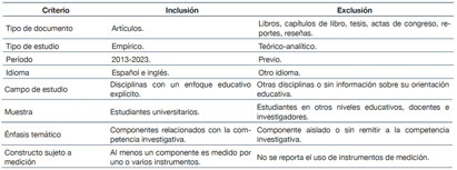 Los criterios de inclusión y exclusión se exponen en la tabla 2. Respecto al campo de estudio, se verificó que los artículos estuvieran relacionados con alguna disciplina dentro del campo de la educación (e. g. pedagogía, psicología educativa o docencia). Por otro lado, para el criterio muestra, se comprobó que la muestra reportada estuviera compuesta total o parcialmente por estudiantes universitarios inscritos en programas de licenciatura, maestría, especialidad o doctorado. En relación con el énfasis temático, se valoró si los componentes sujetos a medición estaban directamente relacionados con la competencia investigativa. Es decir, se excluyeron aquellos artículos donde el objeto de estudio (e. g. pensamiento profundo o creatividad) no estuviera vinculado explícitamente con la labor investigativa, incluso si dichos componentes forman parte de la competencia de interés. Por último, el criterio constructo sujeto a medición discriminó aquellas investigaciones en las que no se reportaba la aplicación de algún instrumento.