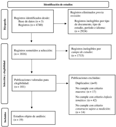 Las bases de datos arrojaron un resultado inicial de 4740 documentos. Una vez aplicados los criterios en torno al tipo de documento, estudio, período e idioma se redujo a 1816. Después, se revisaron títulos, resúmenes, palabras clave y se aplicaron los filtros disponibles en las bases de datos para verificar el criterio área de conocimiento. Esto condujo a una base preliminar de 101 estudios. Tras lo anterior, se hizo lectura de los apartados correspondientes al Método para identificar la muestra, Introducción para valorar el énfasis temático y, particularmente, las técnicas de recolección empleadas para verificar el criterio constructo sujeto a medición. A partir de esto, se consolidó una base de datos con 19 artículos (ver figura 1).