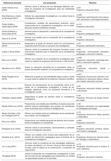 Por otro lado, destaca que una parte significativa de las poblaciones objetivo está conformada por estudiantes que se están formando como profesionales de la educación, es decir para la docencia en una disciplina o de contenidos escolares particulares. Principalmente, relacionados con la enseñanza a nivel primaria (e. g. Mendioroz et al., 2022; Núñez-Rojas et al., 2021), de las matemáticas para la educación básica (e. g. Reyes-González y García-Cartagena, 2014; Sanabria et al., 2014) y en la educación infantil (e. g. Mendioroz et al., 2022; Muşlu-Kaygısız et al., 2018). Esta diversidad refleja un interés por obtener información sobre la adquisición y desarrollo de la competencia investigativa en estudiantes del campo educativo. Esto, a su vez, enfatiza la importancia de reconocer las particularidades tanto de la profesión como de los programas formativos según sus fines, convenciones disciplinarias, contexto sociocultural y condiciones institucionales (Hernández et al., 2019; Martínez-Rizo, 2019) que intervienen en la práctica de la investigación educativa. La tabla 3 sintetiza los hallazgos en relación con los usos propuestos y población objetivo expresada por las muestras reportadas.