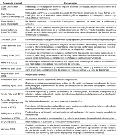Conocimiento metodológico: se refiere al dominio de los etapas y procesos involucrados en el proceso investigativo y de la metodología en la investigación (e. g. García-Gutiérrez y Aznar-Díaz, 2019; Gess et al., 2019; Gómez-Escorcha et al., 2019; Núñez-Rojas et al., 2021; Olazábal y Aguila, 2020; Ravelo-Peña et al., 2019; Wongdee, 2019).