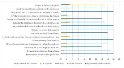 A partir de los datos anteriores, el 100 % de profesores cree que los beneficios del aprendizaje profesional en línea son el intercambio de recursos entre el profesorado, la reducción del tiempo de formación y el coste de la formación, lo que mejora las capacidades para aplicar la tecnología a la enseñanza.