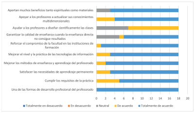 El 94,4% está de acuerdo en que el aprendizaje profesional en línea mejora la participación docente dentro de la institución. Esto demuestra que consideran el valor del aprendizaje en línea en la creación de la cohesión e interacción entre profesores e instituciones, mejorando así la calidad de la experiencia de enseñanza y aprendizaje. El 66,7 % está de acuerdo que el aprendizaje profesional en línea garantiza la calidad de la enseñanza cuando la enseñanza presencial no logra resultados. Los datos muestran que el aprendizaje en línea puede ser una alternativa eficaz cuando las formas tradicionales de enseñanza no ofrecen los resultados deseados. Ninguno de los encuestados estuvo de acuerdo en que el aprendizaje profesional en línea ayuda al profesorado a diseñar conferencias científicas. Esto sugiere que hay un discernimiento en las opiniones de los participantes de la encuesta, y puede haber diferentes opiniones sobre la posibilidad de aprendizaje en línea en el diseño del contenido. El 77,8 % está totalmente de acuerdo en que el aprendizaje profesional en línea ayuda al profesorado a actualizar los conocimientos multidimensionales.