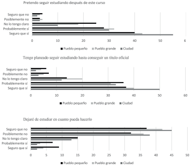 Con respecto a la variable “lugar de residencia” podemos apreciar como el estudiantado que reside en la ciudad es el que presenta mayor intención de continuar los estudios a corto y largo plazo, mientras que el alumnado residente en zonas rurales afirma mayor de intención de abandonar los estudios en cuanto pueda hacerlo.