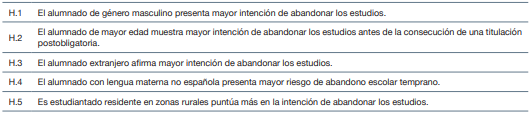 En cuanto a la hipótesis “El alumnado extranjero afirma mayor intención de abandonar los estudios”, en el estudio se aprecia que los y las estudiantes españoles presenta una menor intención de abandono frente al alumnado extranjero. Concretamente, aquellos alumnos que provienen de Marruecos muestran una intención mayor de dejar los estudios en cuanto les sea posible, datos que correlacionan con las investigaciones llevados a cabo por Carrasco et al. (2018), González-Rodríguez et al. (2019), Nada et al. (2020) y Rizo y Hernández (2019). No obstante, esta hipótesis necesariamente debe interpretarse conjuntamente con la hipótesis “El alumnado con lengua materna no española presenta mayor riesgo de abandono escolar temprano”, que tal y como apuntan los datos obtenidos, el estudiantado de lengua no española presenta mayor índice de abandono, siendo concretamente aquellos que tienen como primera lengua el árabe los que presentan mayor intención de dejar los estudios. Los resultados obtenidos en ambas hipótesis pueden estar influenciadas por las acciones político-educativas referentes a la atención a la diversidad que se desarrollen en los centros escolares participantes en el estudio.