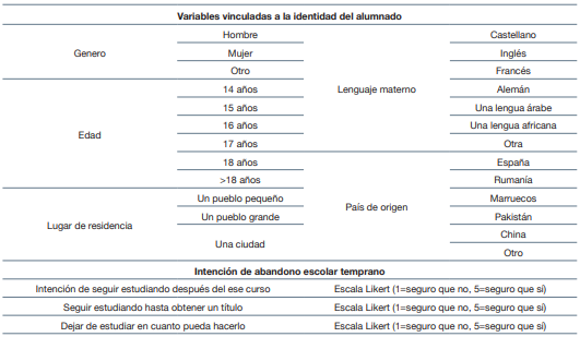 Los principales hallazgos encontrados al respecto apuntan que algunos rasgos identitarios del alumnado influyen sustancialmente en el propósito de que un alumno o alumna concreto continúe su proceso formativo. Concretamente, se ha comprobado que el alumnado de género masculino presenta un índice mayor de intención de abandono de los estudios prematuramente, posiblemente por la diferencia de oportunidades laborales entre géneros sin la obtención de una titulación. Además de ello, el estudio también muestra que el alumnado de mayor edad es el que presenta una menor intención de continuar con los estudios hasta la obtención de una titulación postobligatoria, variable mediatizada por el peso que presenta la repetición de algún curso escolar en el abandono escolar temprano.