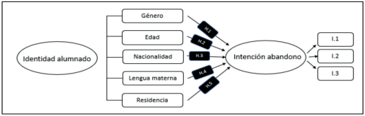 Con base en el análisis de la literatura sobre el fenómeno del abandono escolar y su vinculación con ciertos rasgos de la identidad del individuo, el presente estudio se plantea como principal pregunta de investigación “¿Cuál es la influencia de ciertos rasgos identitarios del alumnado sobre la intencionalidad de abandono de los estudios?”. De esta pregunta se deriva el objetivo principal de estudio Analizar la influencia de los factores vinculados a la identidad del alumnado en la intención de abandono escolar prematuro, objetivo en el que se anclan las siguientes hipótesis de trabajo.