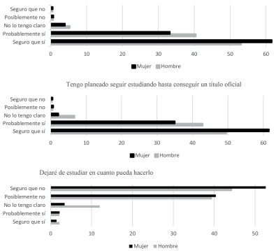 Nota. Elaboración propia a partir de Suberviola (2021).Con respecto a la variable “género”, un mayor número de mujeres afirma tener intención de seguir estudiando en los siguientes cursos escolares, concretamente el 75 % de alumnas frente al 50 % de alumnos. Por otro lado, el 50 % de las mujeres aseveran la intención de no abandonar los estudios a pesar de que pudieran hacerlo sin consecuencias negativas, frente a un escaso 25 % de hombres que asienten que seguirían estudiando en dichas condiciones. En la siguiente figura se presentan los gráficos generados a partir de las respuestas dadas por los estudiantes encuestados a los tres ítems sobre intención de abandono.