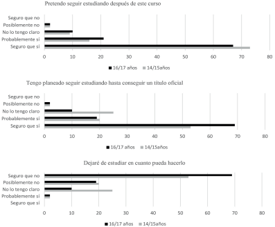 Con respecto a la variable “edad” se observan algunas diferencias entre los distintos grupos, siendo el alumnado de ≥18 años el que mayor intención de abandono presenta, mientras que el alumnado más joven presenta más inseguridad sobre su futuro académico, puesto que un 18 % del estudiantado de 14-15 años afirma no tener claro seguir estudiando hasta la consecución de una titulación oficial.