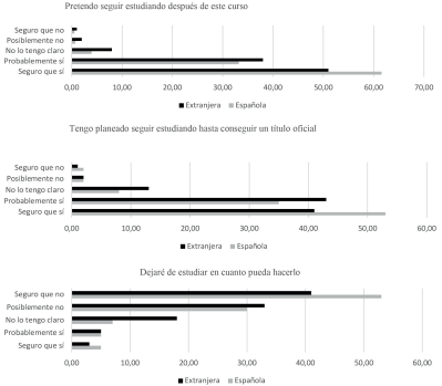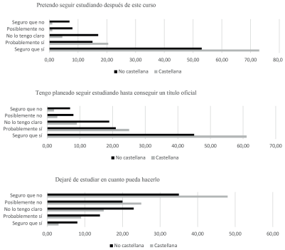 Como se puede apreciar en la figura 5, el alumnado de lengua materna no castellana presenta una menor intención de continuar los estudios tanto a corto como a largo plazo, frente al estudiantado con lengua materna castellana, sea o no de nacionalidad española.