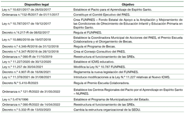La estructuración de contenidos y procesamiento de la información se realizaron a la luz de la propuesta de Bardin (1970). En la fase de investigación material se categorizaron los contenidos, los cuales fueron organizados en dos líneas que estructuran el artículo: 1) documentos y textos que abordaron el proceso de difusión de la política en Espírito Santo; 2) documentos que describieran la fase inicial de implementación del programa. El siguiente paso implicó una lectura más detallada de la documentación para identificar la presencia de contextos desafiantes en el proceso de difusión interestatal. El siguiente cuadro recoge la legislación analizada.
