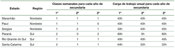 Respecto a la reducción de la carga horaria de las clases de educación física, es plausible concluir que no se trata de un movimiento aislado, pareciera que, en medio del proceso de precarización de la educación, con énfasis en la implementación de lo que se conoció como Nueva Educación Secundaria, los cambios se vuelven recurrentes y afectan tanto a la región Nordeste como al Sur del país, donde se ubican los institutos cubiertos en este trabajo (tabla 1).