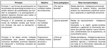 El DUA se erige sobre tres principios neuropsicológicos fundamentales basados en la idea de que la función cerebral depende de tres redes neurológicas diferentes, pero interconectadas (reconocimiento, estrategia y afectiva), de tal forma que cada una interviene en los procesos de enseñanza-aprendizaje (García-Campos et al., 2020; Rose y Meyer, 2002). Estos principios se traducen a su vez en nueve pautas y 31 indicadores orientados a facilitar su implementación práctica en el contexto educativo, que cada vez es más diverso y heterogéneo (CAST, 2018b). En la tabla 1 se muestran estos principios y se explican sus objetivos y asociaciones pedagógicas en relación con su base neuropsicológica.