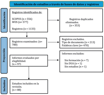 Finalmente, durante el proceso de lectura se detectaron nueve publicaciones que se consideraron no apropiadas para su inclusión por diversos motivos. En algunos casos, la investigación se centraba en el papel del DUA, pero no en la formación docente (N=7); por el contrario, otros destacaban el proceso de formación del profesorado sin integrar el DUA en el artículo (N=1). Por último, una de ellas se enmarcaba fuera de los límites del área de la educación (N=1). Así, desde una perspectiva internacional, se obtuvo una muestra final de 88 artículos que estudiaban la integración del DUA en los procesos de formación docente entre 2008 y 2022. La información se extrajo mediante el uso de la herramienta Excel, que facilitó su categorización basada en las preguntas de investigación, así como la revisión y el análisis del contenido.