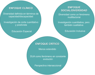 La literatura describe el DUA como un modelo examinado en la formación docente desde múltiples perspectivas. Entre ellas, predomina un enfoque clínico, que destaca el papel del DUA para trabajar con estudiantes con necesidades educativas especiales, especialmente relacionadas con la discapacidad. De igual forma, surge un enfoque alternativo que considera el DUA como un marco ideal para responder a la diversidad entendida como un fenómeno positivo (Benet-Gil et al., 2019) y multifactorial (Bartz y Kleina, 2021) que enfatiza los factores contextuales, el enfoque social. Finalmente, emerge una perspectiva más crítica que propone una revisión continua de sus principios y aboga por emplear el DUA no como una herramienta única, sino como un recurso valioso para abordar, desde un enfoque interseccional, los sistemas de opresión estructurales que generan mecanismos de exclusión educativa y vulnerabilidad (Fornauf et al., 2021; Fornauf y Mascio, 2021).