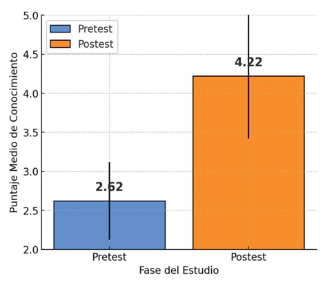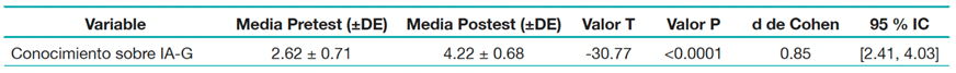 El tamaño del efecto, medido con d de Cohen (0.85), indica un impacto considerable en la adquisición de conocimientos técnicos en la tabla 1 y en la figura 1, muestran la puntuación media en conocimiento de IA-G pasó de 2.62 en el pretest a 4.22 en el postest, lo que respalda la efectividad del programa formativo (Dai et al., 2023).