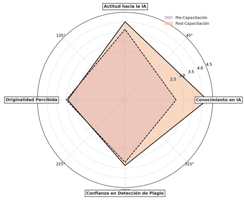 Para facilitar la visualización de estos resultados y sus comparaciones, la figura 2 muestra la evolución de las cuatro dimensiones analizadas antes y después de la capacitación. Este gráfico permite identificar con claridad los cambios experimentados en el conocimiento técnico y la actitud hacia la IA, así como la estabilidad en la percepción de originalidad y la confianza en los sistemas de detección de plagio (Cordero et al., 2024).