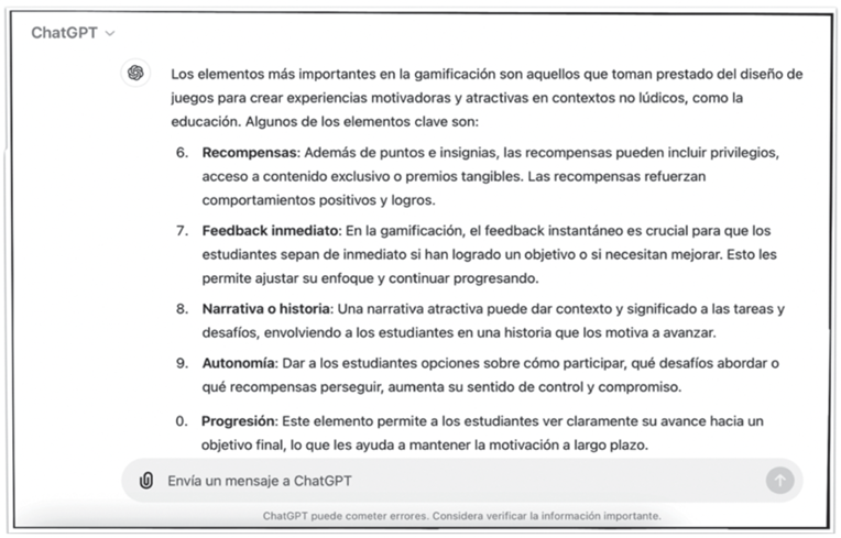 Ante esta pregunta de qué se considera gamificación en el ámbito educativo, la respuesta que da la IA es la siguiente: La gamificación en educación se refiere al uso de elementos, dinámicas y principios propios de los juegos en contextos educativos con el objetivo de motivar, involucrar y mejorar el aprendizaje de los estudiantes. Además, en la práctica, la gamificación puede incluir el uso de puntos, insignias, niveles, desafíos y recompensas, que se integran en las actividades académicas para hacer el aprendizaje más interactivo y divertido. Al hacerlo se promueve un ambiente en el que los estudiantes se sienten más motivados a superar retos, colaborar con sus compañeros y mejorar su rendimiento.