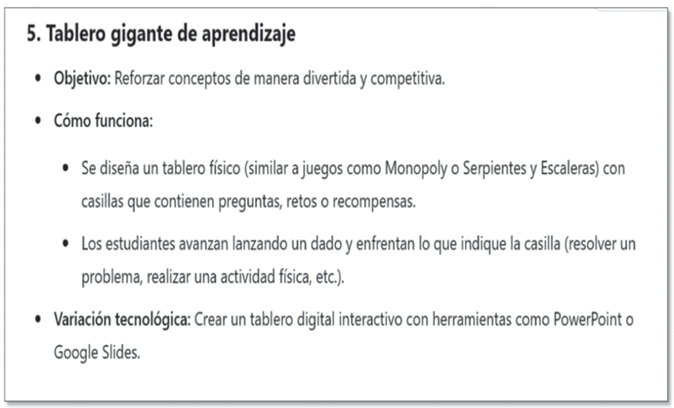 Otro ejemplo práctico lo apreciamos en la figura 2, donde también existe un error de conceptualización de la gamificación. De hecho, tal y como expresan Navarro-Mateos et al. (2021), en una revisión sistemática sobre el estado de la gamificación en el panorama educativo español, en muchas ocasiones el término ABJ y gamificación se usan de manera indistinta, lo que es un grave error. Esto ocurre en el nuevo ejemplo que proporciona la IA, pues sugiere adaptar un tablero de juego similar al del Monopoly para incluir preguntas relacionadas con contenidos de la asignatura. En este caso lo que propone ChatGPT es un ejemplo de serious game, pues plantea el diseño de un juego con fines educativos específicos, incorporando contenidos que facilitan el aprendizaje de temas relevantes a través del enfoque divertido y dinámico que caracteriza a los juegos (Pérez-López, 2020).
