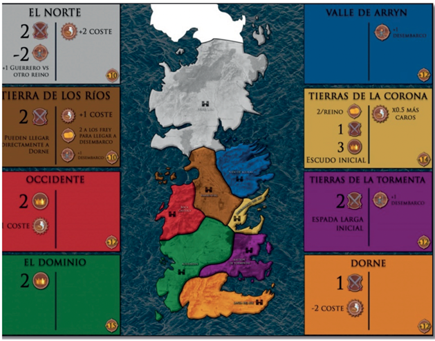 Mapa de Poniente y ventajas y contraprestaciones de cada reino