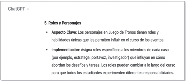 La IA tiene mucha razón cuando dice que los roles y habilidades de los personajes influyen en el curso de los eventos. Ahora bien, los roles que aparecen en Juego de Tronos tienen relación directa con el estatus como, por ejemplo, Rey de Poniente o Lord Comandante. Sin embargo, los roles que plantea la IA no tienen absolutamente nada que ver con la narrativa, sino con aquellos otorgados en metodologías activas como el aprendizaje cooperativo. Además, en la serie no existen cambios de roles sin justificación, se puede progresar y escalar (por ejemplo, si eres miembro de La Guardia de la Noche, puedes convertirte en Lord Comandante de La Guardia de la Noche), pero no dejar de lado tu origen y contexto.