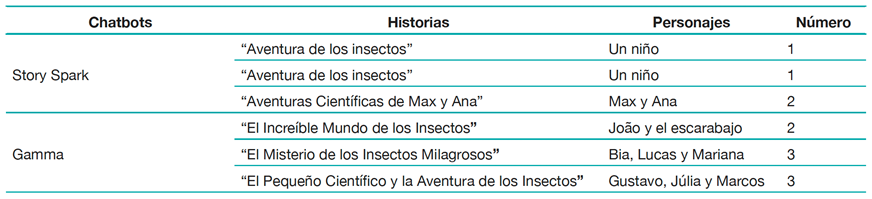 Nota. Datos de la investigación (2025).Es importante resaltar que independientemente del chatbot y el prompt utilizado, los personajes creados se referían a personajes infantiles, de la misma edad de los niños a quienes iban destinadas las historias (6 a 8 años), lo cual es un punto positivo en las historias creadas por GenIA, ya que esta personificación al tratarse de niños, de edad escolar temprana, indica a los lectores que el propio niño es capaz de investigar, observar fenómenos naturales, explorar el entorno, investigar, registrar y compartir conocimientos. El astrónomo estadounidense Carl Sagan afirmó en una de sus entrevistas que todo el mundo comienza la vida como científico (Guimarães, 2007).