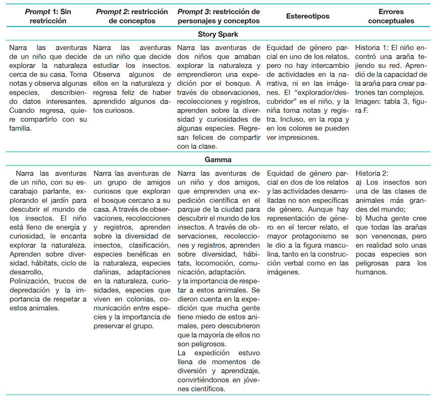 Los resultados del análisis de los modelos generados por GenIA muestran que fueron capaces de crear historias para niños respondiendo a indicaciones específicas. La tabla 1 presenta una visión general de los personajes y la tabla 2 ofrece un resumen de las narrativas, el estereotipo de los personajes y los errores conceptuales encontrados.