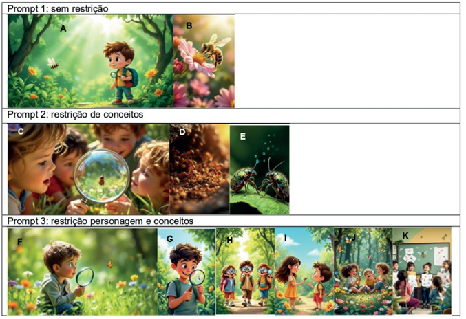 Siguiendo con las situaciones de estereotipos, merece destacarse la imagen H, presentada en la tabla 4, pues se refiere al uso del prompt 3. Cuando se les pidió que contaran la historia de personajes vinculados a la Ciencia, se mostró a los niños caminando por el bosque, explorando el entorno, pero usando lentes, además de sus lupas. Este estereotipo también ha persistido en la literatura, dando la idea de un estereotipo tradicional de los científicos, vinculado principalmente a la figura masculina, como personas muy inteligentes y con gafas. Es necesario desmitificar estos estereotipos y ser conscientes de esta situación es esencial, especialmente en los primeros años.