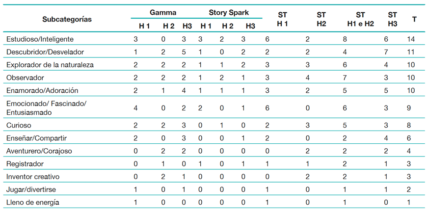 Se puede observar que los personajes presentaron estereotipos comunes, independientemente del mensaje utilizado, lo que permitió establecer un perfil más común; es decir, caracterizados principalmente como “eruditos, descubridores y exploradores, apasionados por lo que hacen”. La categoría permitió identificar trece subcategorías del análisis a posteriori, no apareciendo ninguna subcategoría adicional cuando se utilizó el prompt 3, lo que indica que el uso de la restricción para vincular el personaje a Ciencia no interfirió en las características de los adjetivos. El hecho de que anteriormente mencionaran que realizaban actividades científicas ya les otorgaba los mismos adjetivos.
