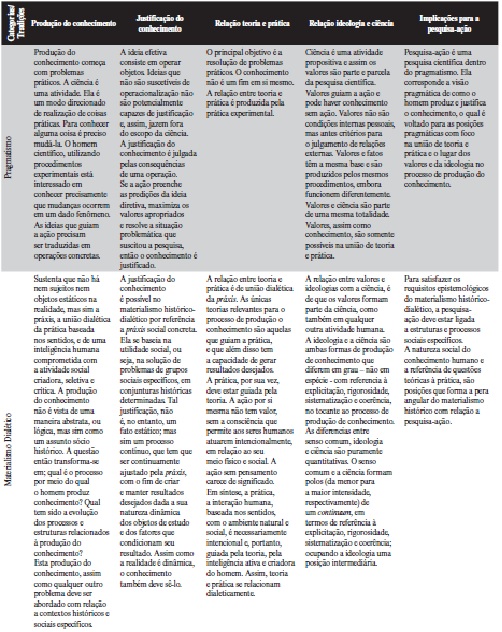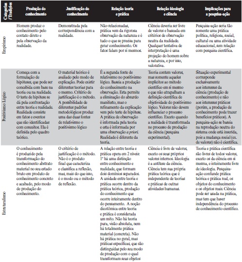 Em um trabalho seminal dedicado especificamente à questão da epistemologia da PA, Paul Oquist114 aborda cinco tradições de pesquisa diferentes –empirismo, positivismo lógico, estruturalismo, pragmatismo e materialismo dialético– para realizar uma análise comparativa acerca dos pressupostos epistemológicos de cada uma dessas tradições, cotejando-as com as características da PA, identificando quais seriam as tradições, de fato, fornecem bases possíveis para a sustentação da PA. Para realizar tal comparação, aparando as arestas entre o debate teoria versus prática e ideologia versus ciência –questões que permeiam a fronteira tênue entre conhecimento científico e ação social, que são os principais fundamentos da PA– Oquist115 considera cinco questões como categorias fundamentais e que estão presentes, de forma diferenciada, em cada uma das tradições analisadas: (1) o modo como o homem produz o conhecimento; (2) o modo como o homem justifica o conhecimento; (3) qual a relação entre teoria e prática; (4) qual a relação entre valores ou ideologia e ciência; e (5) quais as implicações para a PA (cf. quadro 1).