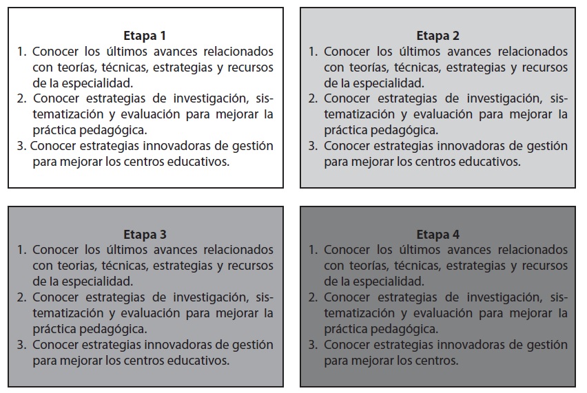 En dicho informe, la siguiente figura muestra las prioridades para el personal docente por etapa de desarrollo profesional, en relación con el saber conocer.