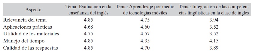 En relación con la realimentación del evento, los participantes expresaron sus opiniones y percepciones de las tres temáticas en función de cinco aspectos puntuales. Seguidamente se muestran sus apreciaciones, cuya escala es: 1 = Deficiente y 5 = Excelente.