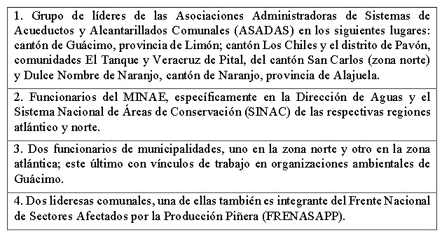 Entre una variedad de luchas de ASADAS, comunidades, vecinos, pequeños y medianos productores, indígenas, organizaciones sociales, políticas, ambientales y culturales, en varias zonas geográficas, imbricadas al accionar de un «sujeto colectivo» de movimientos sociales, regionales y nacionales, tales como el ecofeminista, ambientalista, indígena, sindical, estudiantil y académico de universidades públicas, articulado en forma de red al territorio y que conlleva, de una parte, a la «autoconstrucción» de subjetividades, y por la otra, a «determinaciones objetivas en términos de relaciones sociales» e incluyen «relaciones de producción»67; que refieren a una lucha con presencia de actores sociales con identidades y «origen social» diverso, convocados, en este caso, por la asimetría en las relaciones de poder desigual por acceso al agua frente a los actores empresariales e institucionales.