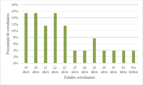 Elaboración propia.En el primer nivel las edades del estudiantado oscilan entre los 17 y 20 años, solo hay una persona fuera de ese espectro, con 27 años; en los otros niveles, el rango de edad se encuentra entre los 19 y 30 años, solamente hay una persona de 52 años (Figuras 2 y 3).