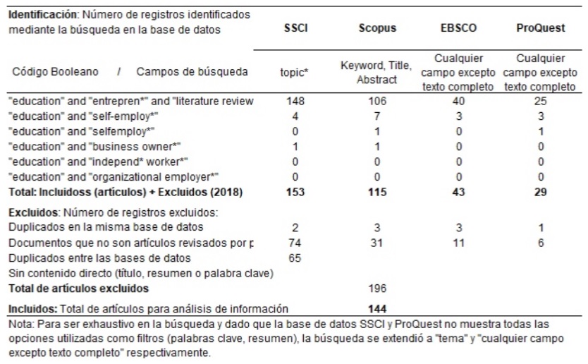 Los campos de búsqueda en cada base de datos fueron: título, resumen o palabras clave, así como cualquier campo, excepto texto completo. El código booleano que se empleó fue el prefijo «entrepren*» con el conector «AND» para que mostrarán las publicaciones relacionadas con el tema, como se observa en la Tabla 1.
