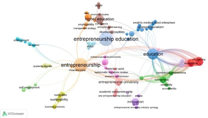 Fuente: Elaboración propia, elaborado con el programa Vosviewer.Cinco clústeres que se asocian con la educación emprendedora.