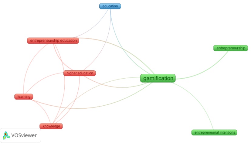 El campo científico de la gamificación y emprendimiento tiene relación con muchas otras áreas del conocimiento, tan variadas como la intención emprendedora, el desarrollo de apps, las generaciones temporales, aplicación de programas, la medicina alterna y, por supuesto, la educación. Sin embargo, la distribución y agrupamiento que muestra la figura 3 permite observar las relaciones e importancia, que la unión de estos dos constructos genera, como la intención de emprender y el emprendimiento (clúster verde); educación (clúster azul); y educación emprendedora, conocimiento y aprendizaje (clúster rojo).