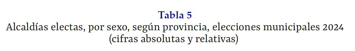 En lo que respecta a las alcaldías electas en las elecciones municipales de febrero del 2024, en la Tabla 4 se puede observar que de 84 alcaldías solo en 22 resultaron electas mujeres, mientras que en 62 de ellas se designó a un hombre, por lo cual a nivel nacional solo un 26,19 % de las alcaldías durante el periodo 2024-2028 será ocupado por mujeres.