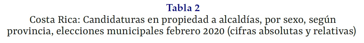 Costa Rica: Candidaturas en propiedad a alcaldías, por sexo, según provincia, elecciones municipales febrero 2020 (cifras absolutas y relativas)