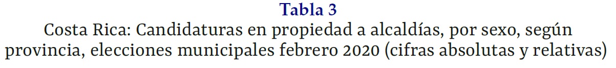 De acuerdo con los datos del TSE, sobre alcaldías electas desagregados por provincia, en las elecciones municipales de 2020, en el caso de San José, de las 20 municipalidades, solo en dos se eligió a una mujer para el puesto; en Alajuela, de 16 alcaldías, en tres se eligió a una mujer; en el caso de las provincias de Cartago, Heredia y Guanacaste, en cada una se designó a una mujer para la alcaldía, pese a que contaban con ocho, diez y once puestos respectivamente. Por último, las dos provincias en las que no se eligió mujeres para las alcaldías fueron Puntarenas y Limón, por lo cual la totalidad de puestos fueron asumidos por hombres (Tabla 3).