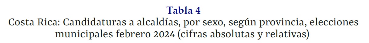 Para las elecciones municipales de febrero del 2024, en total se presentaron 558 candidaturas a alcaldía, de las cuales 239 correspondieron a mujeres (42,8 %) y 319 a hombres (57,2 %). Si se observan los datos del TSE desagregados por sexo según provincia, se puede señalar que la participación de las mujeres en estas selecciones se encontró entre el 38,0 % y el 48,6 %, las provincias que presentaron menor porcentaje de candidaturas por parte de mujeres fueron Puntarenas y San José con 38,0 % y 40,4 % respectivamente, mientras que las que tuvieron mayor participación fueron Heredia con 48,6 % y Cartago con 45,9 %. En el caso de los hombres, su participación en las candidaturas para las alcaldías a nivel nacional osciló entre el 51,4 % y 62,0 % (Tabla 4).