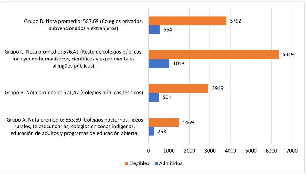 En total solo un 33 % de quienes aspiraron al TEC provenientes del sistema público logró la condición de elegible, mientras que 69,2 % de estas personas provenientes de colegios privados lo lograron (2043 de 2953 aspirantes) y un 68,6 % de aquellas provenientes del sistema semipúblico (1512 jóvenes, 1053 resultaron elegibles). Los datos de la población admitida son bastante más alentadores, pues un 70 % de quienes finalmente adquieren un cupo provienen de instituciones públicas o semipúblicas81.