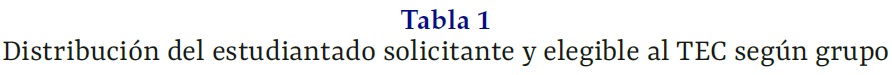 Distribución del estudiantado solicitante y elegible al TEC según grupo