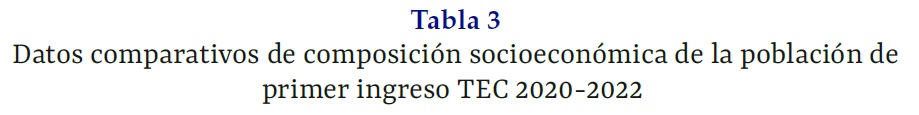 Datos comparativos de composición socioeconómica de la población de primer ingreso TEC 2020-2022